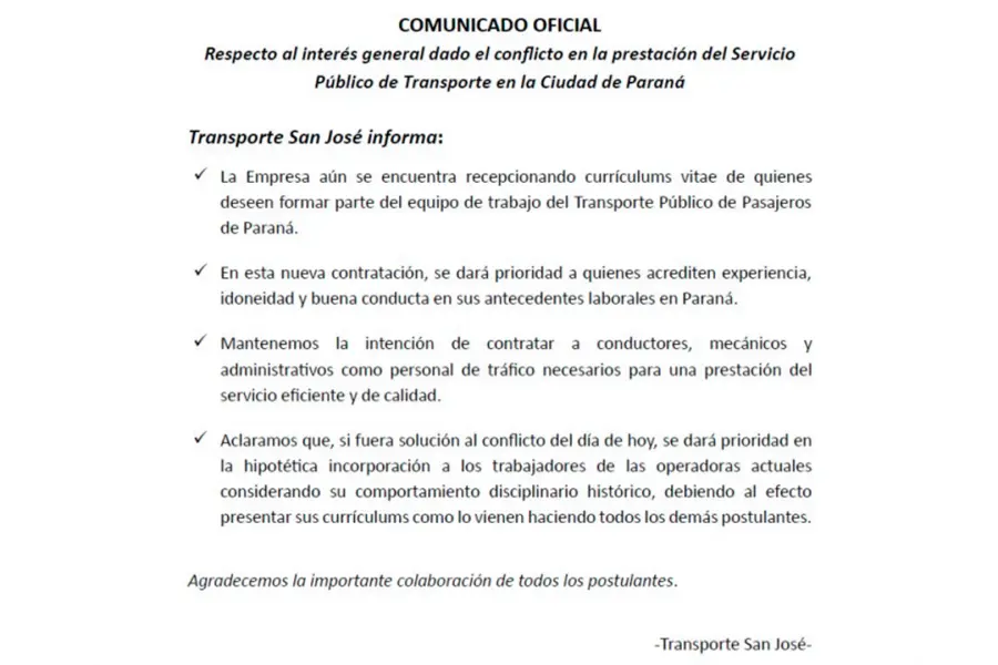 Transporte San José, la empresa que se hará cargo del servicio de transporte urbano de pasajeros de la ciudad de Paraná a partir de diciembre, emitió un comunicado en el hace referencia a la incorporación de personal. La aclaración surge en medio de los conflictos y el paro sorpresivo que se realizó este miércoles y dejó a los usuarios sin colectivos durante cuatro horas.